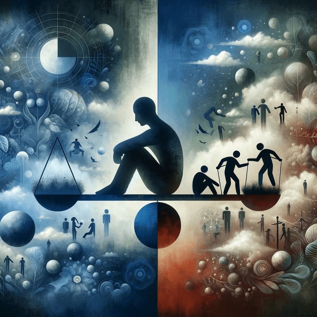 Ego ve kişisel gelişim ile sosyal katkı arasındaki dengeyi simgeleyen bir resim. Bu resimde, bir yandan derin düşünce içinde olan ve kendini fark etme ile kişisel büyümeyi temsil eden bir kişi, diğer yandan ise birlikte çalışan insanları ve sosyal katkı ile empatiyi simgeleyen bir sahne yer alıyor. İki taraf arasında bir denge betimleniyor ki bu, bireysel ve sosyal refah için ego dengesinin önemini vurgulamakta. Resmin genel tonu, uyum ve bağlantı hissini yansıtıyor.