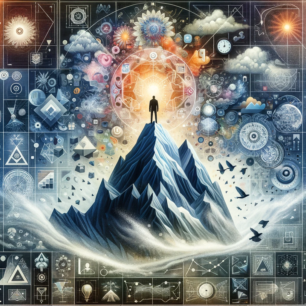Alışkanlıkların kişisel gelişimi ve hayatı şekillendirme konseptini temsil eden bir resim. Resimde, merkezde duran bir insan figürü ve bu figürün etrafında alışkanlıkları, kişisel değerleri ve duygusal yönetimi temsil eden çeşitli semboller ve unsurlar yer alıyor. Arka planda, görünür ve gizli alışkanlık yönlerini simgeleyen, suyun üstünde görünen ucu ve daha büyük bir kısmı batık olan büyük bir buz dağı bulunuyor. Ayrıca kişisel hedefler, sosyal etkileşimler ve öz-refleksiyonu temsil eden öğeler de eklenmiş. Resmin genel atmosferi, kişisel gelişimi ve alışkanlıkların hayatımızı şekillendirmedeki karmaşıklığını iletmekte.