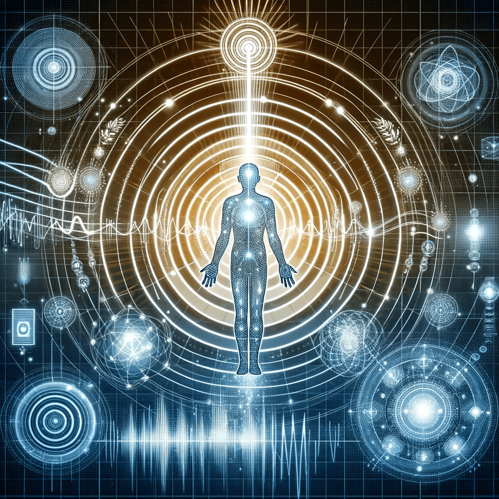 Bu resimde, enerjisel etkileşimlerin bir ortamı olarak insan figürü bir alıcı-verici anten gibi tasvir edilmiş. Figürün çevresinde, enerji ve bilgi aktarımını vurgulamak amacıyla frekans dalgaları, enerji dalgaları ve parlayan küreler gibi iletişimi temsil eden net görsel unsurlar yer alıyor.