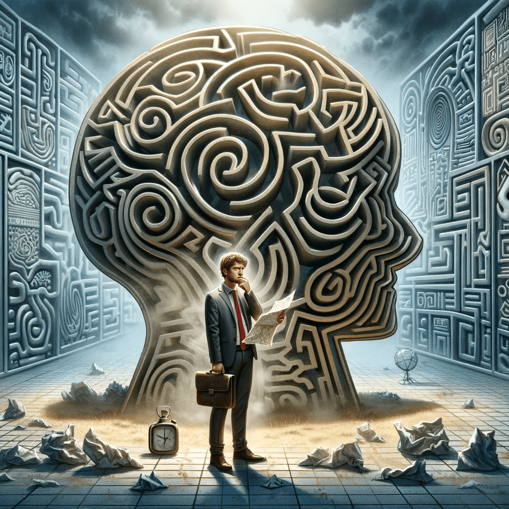 Dunning-Kruger Etkisi’nin ve anlayış ile öz-farkındalık zorluklarının bir temsili. Resimde, bilgi ve anlayışın karmaşık labirentinden geçme yolculuğunu simgeleyen, devasa ve karmaşık bir labirentin önünde duran bir kişi görülmekte. Kişi şaşkın bir ifadeyle buruşmuş bir harita tutuyor, bu da sınırlı anlayışa rağmen bilgi labirentini geçme konusunda aşırı güvenlerini vurguluyor. Arka planda, bireyin bilgi ve becerilerindeki sınırlılıklarını tanıma temasına derinlik katan, bilişsel yanlılıkları temsil eden soyut unsurlar bulunuyor.