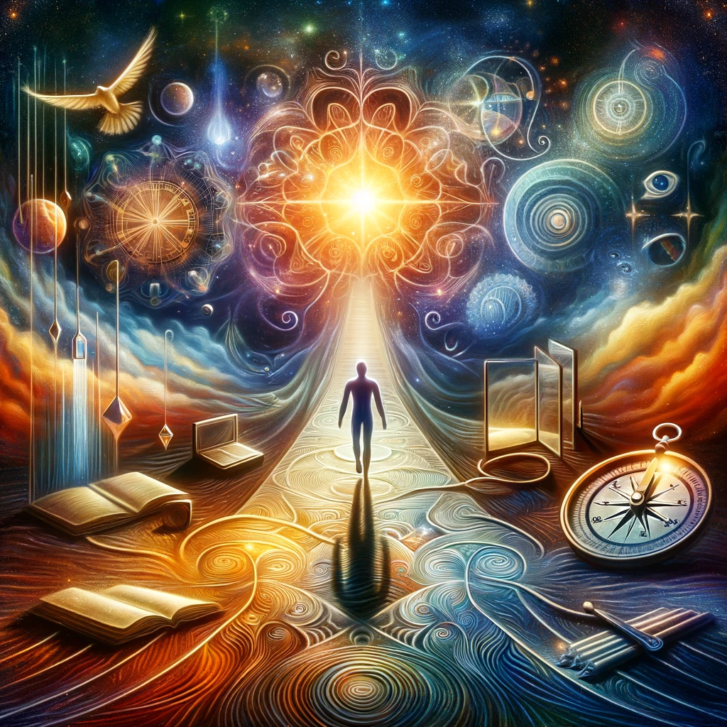 Kendini keşfetme ve kendini bilmeye yönelik yolculuğun soyut bir temsili. Bu resimde, kendini anlama sürecine yardımcı olan araçlar ve deneyimleri simgeleyen aynalar, kitaplar ve bir pusula gibi çeşitli iç gözlem sembolleri ile birlikte, kendine dair farkındalığı temsil eden canlı, aydınlanmış bir figüre doğru ilerleyen metaforik bir yol betimleniyor. Resmin genel atmosferi, aydınlanma, büyüme ve derin öz-anlayışı yansıtan, etkileyici ve düşsel bir manzara içinde yer alıyor.
