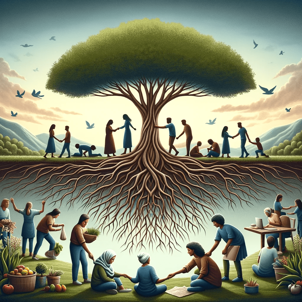 Sakinlik, mutluluk, bağlantı, yardımsever eller, iyilik, kökler, temel ve yapı kavramlarını temsil eden bir resim. Sakin bir manzara içinde, insanların iyilik dolu davranışlarda bulundukları ve köklü, büyük bir ağacın istikrar ve temeli sembolize ettiği bir ortamı gösteriyor.
