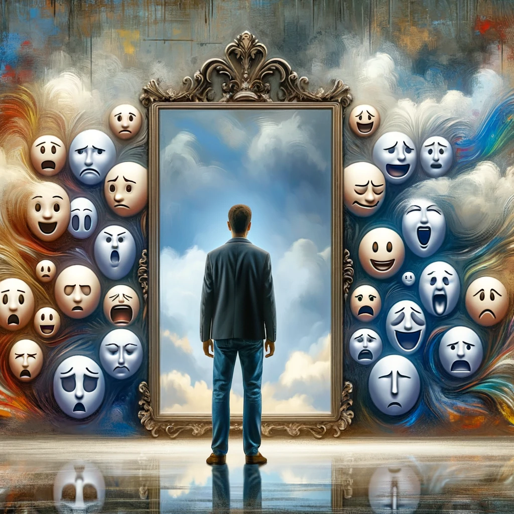 Çeşitli duygusal ifadeleri yansıtan yüzlerle dolu büyük, süslü bir ayna karşısında duran bir kişiyi betimliyor.