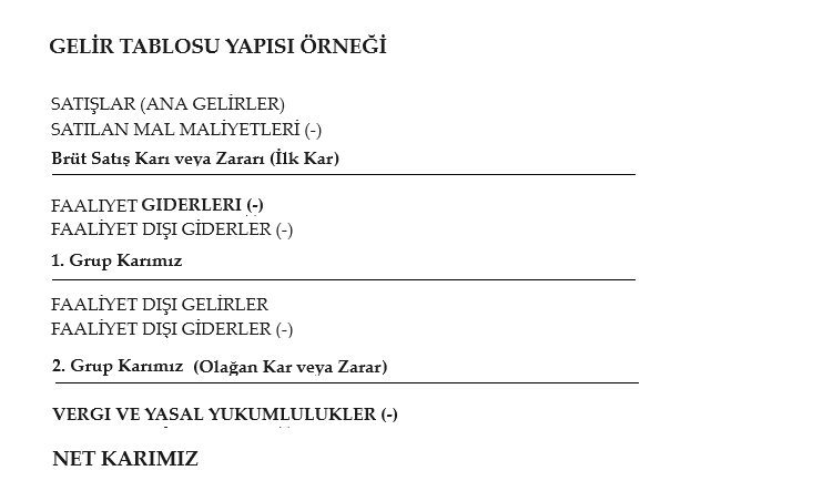 Bu tablo, belirli bir dönemdeki faaliyetlerimizden elde edilen gelir ve gider hesaplarını detaylandırır, yani bilanço döneminde nasıl bir mali performans sergilediğimizi özetler. Kısaca, en son ne kadar kazandığımızı gösterir.
